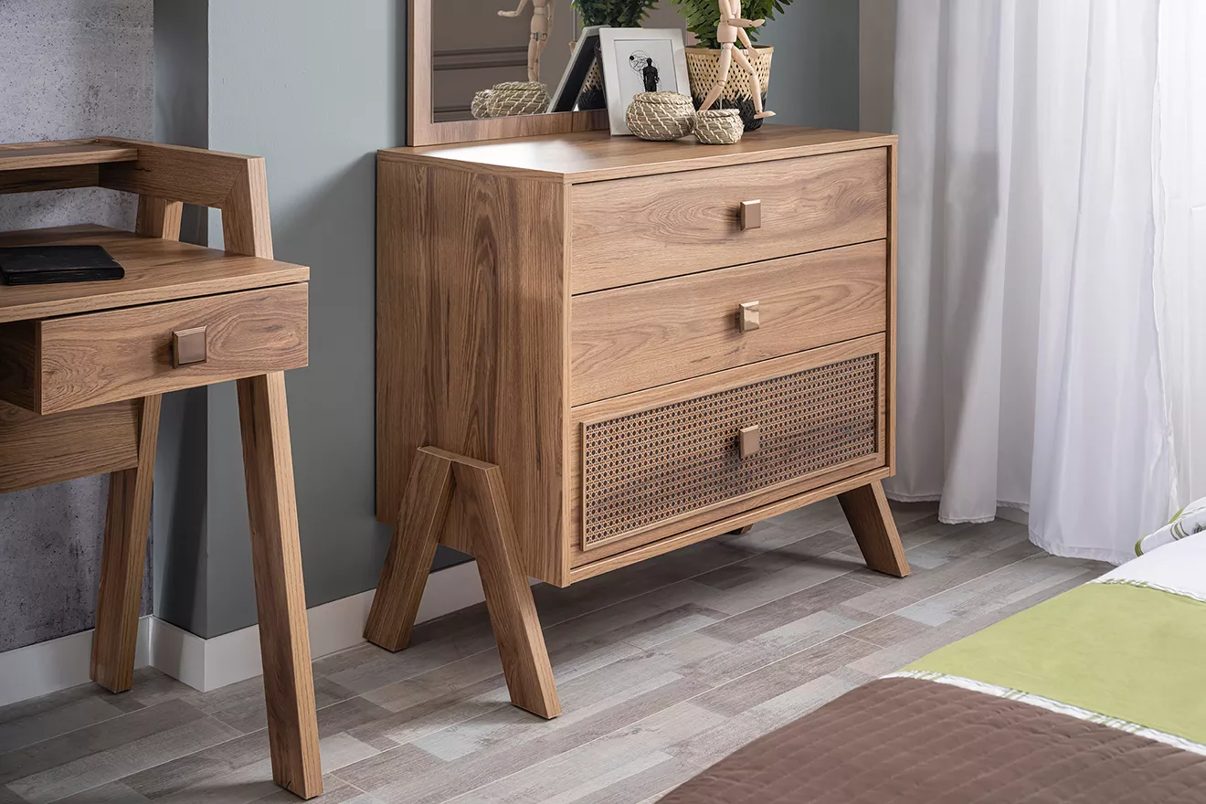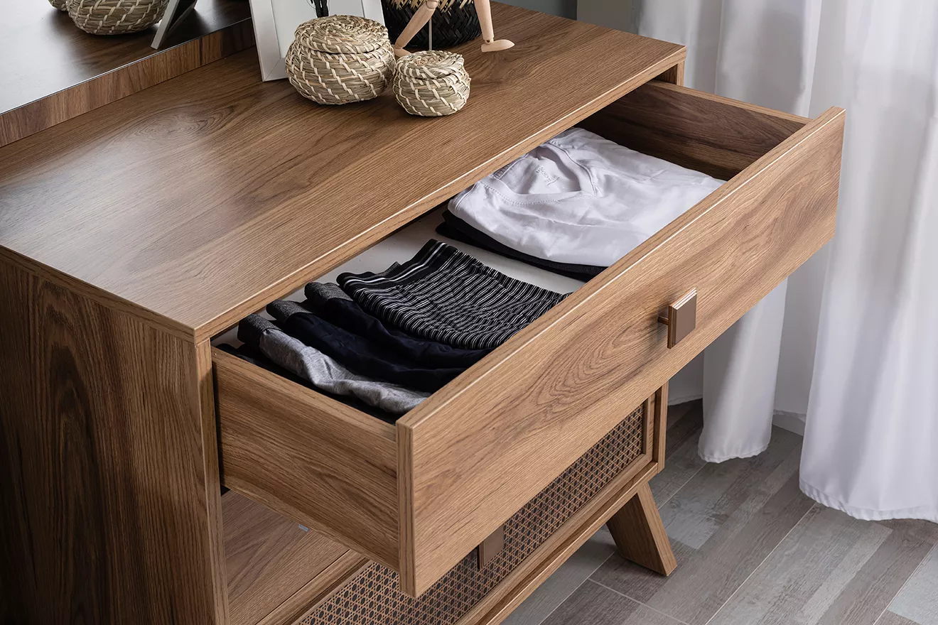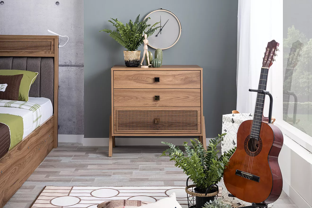 Çok amaçlı ve derinlik ve geniş hacimli şifonyer, gençlerin ihtiyaç duyabileceği her şeyi saklamak için yeterli alan sunar. Ayrıca, çok raflı kullanışlı kitaplık, gençlerin okul kitapları ve kişisel kitapları için idealdir.